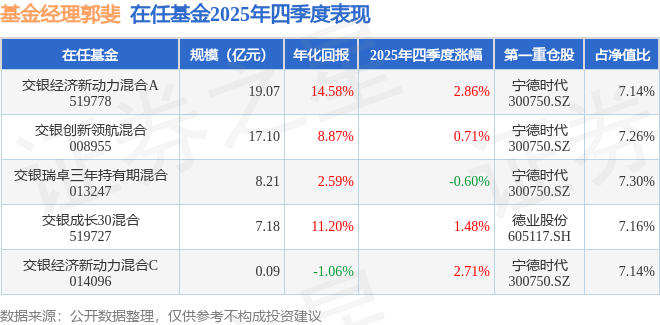 证券之星消息,截止2025年四季度末,基金经理郭斐旗下共管理5只基金,本季度表现最佳的为交银经济新动力混合A(519778),季度净值涨2.86%。