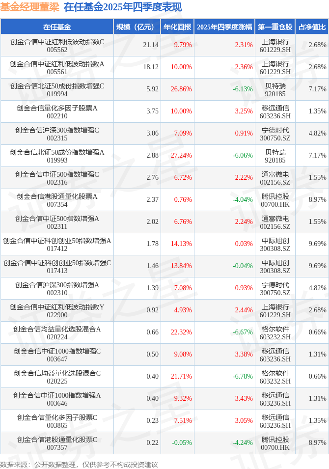 董梁管理的创金合信中证科创创业50指数增强A基金在24年1季度买入中际旭创,已连续持有1年又3个季度。持有期间的估算收益率为182.72%,持有期间中际旭创在2024年到2025年的中报归属净利润增幅达69.4%。