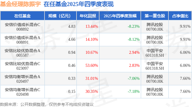 证券之星消息,截止2025年四季度末,基金经理陈振宇旗下共管理6只基金,本季度表现最佳的为安信比较优势混合A(005587),季度净值涨2.94%。