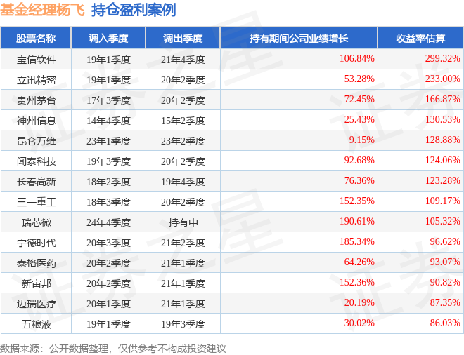 杨飞管理的国泰金龙行业混合基金在19年1季度买入宝信软件,在持有2年又3个季度后在21年4季度卖出。持有期间的估算收益率为299.32%,持有期间宝信软件在2019年到2021年的年报归属净利润增幅达106.84%。