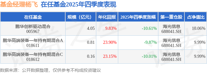 证券之星消息,截止2025年四季度末,基金经理杨飞旗下共管理3只基金,本季度表现最佳的为鹏华高端装备一年持有期混合A(018611),季度净值跌9.87%。