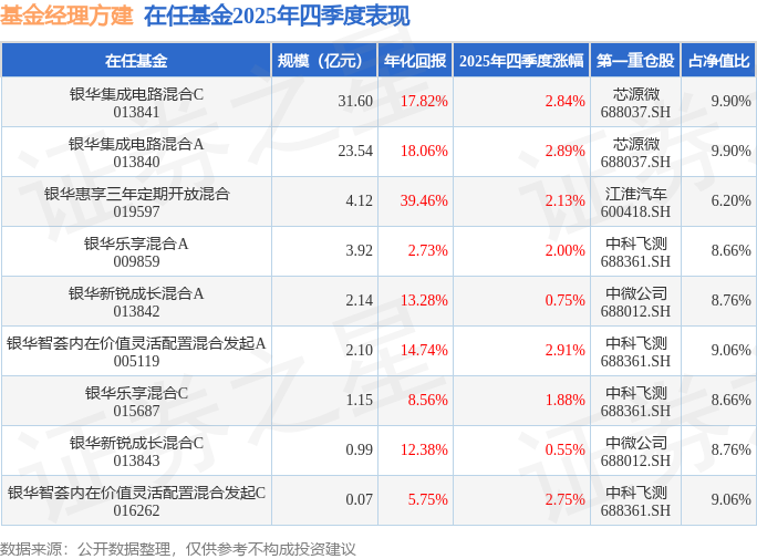 方建管理的银华智荟内在价值灵活配置混合发起A基金在23年4季度买入中际旭创,在持有1年又0个季度后在24年4季度卖出。持有期间的估算收益率为93.5%,持有期间中际旭创在2023年到2024年的年报归属净利润增幅达137.93%。