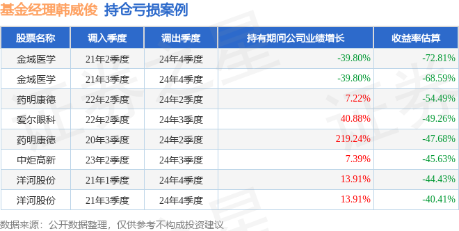 韩威俊管理的交银股息优化混合基金在21年2季度买入金域医学,在持有3年又2个季度后在24年4季度卖出。持有期间的估算收益率为-72.81%,持有期间金域医学在2021年到2024年的年报营业总收入降幅为39.8%。