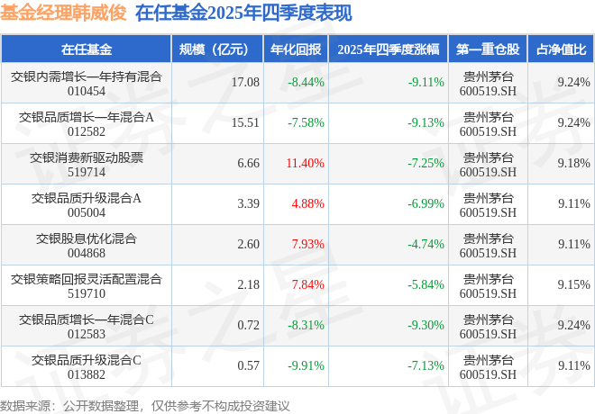 证券之星消息,截止2025年四季度末,基金经理韩威俊旗下共管理8只基金,本季度表现最佳的为交银股息优化混合(004868),季度净值跌4.74%。
