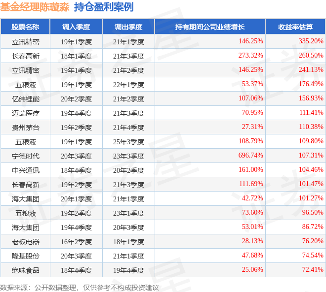 陈璇淼管理的鹏华优势企业基金在19年1季度买入立讯精密,在持有2年又0个季度后在21年1季度卖出。持有期间的估算收益率为335.2%,持有期间立讯精密在2019年到2021年的年报营业总收入增幅达146.25%。