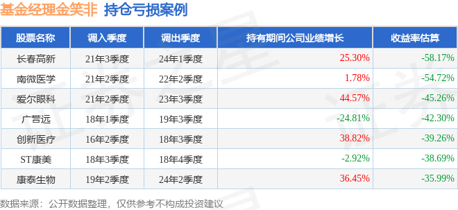 金笑非管理的鹏华创新升级混合A基金在21年3季度买入长春高新,在持有2年又2个季度后在24年1季度卖出。持有期间的估算收益率为-58.17%,持有期间长春高新在2021年到2024年的年报营业总收入增幅达25.3%。