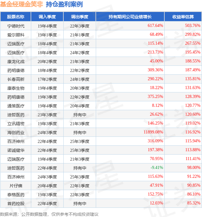 金笑非管理的鹏华创新动力LOF基金在19年4季度买入宁德时代,在持有2年又3个季度后在22年3季度卖出。持有期间的估算收益率为503.76%,持有期间宁德时代在2019年到2022年的年报营业总收入增幅达617.64%。