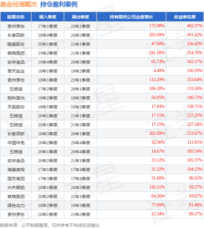 戴杰管理的汇安丰泽混合A基金在17年1季度买入贵州茅台,在持有6年又0个季度后在23年1季度卖出。持有期间的估算收益率为403.37%,持有期间贵州茅台在2017年到2023年的年报归属净利润增幅达175.98%。