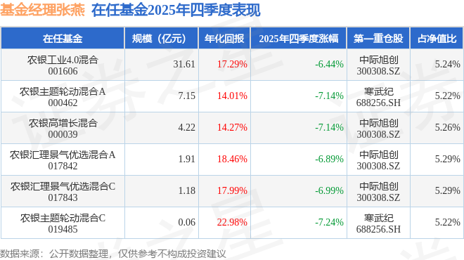 证券之星消息,截止2025年四季度末,基金经理张燕旗下共管理6只基金,本季度表现最佳的为农银工业4.0混合(001606),季度净值跌6.44%。