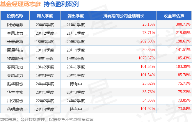 汤志彦管理的鹏华弘嘉混合A基金在20年3季度买入阳光电源,在持有2个季度后在21年1季度卖出。持有期间的估算收益率为300.71%,持有期间阳光电源在2020年到2021年的年报营业总收入增幅达25.15%。