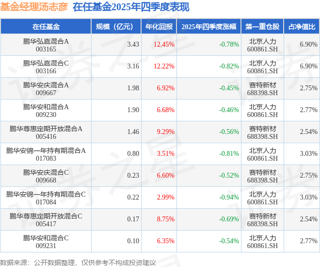 证券之星消息,截止2025年四季度末,基金经理汤志彦旗下共管理10只基金,本季度表现最佳的为鹏华安庆混合A(009667),季度净值跌0.45%。