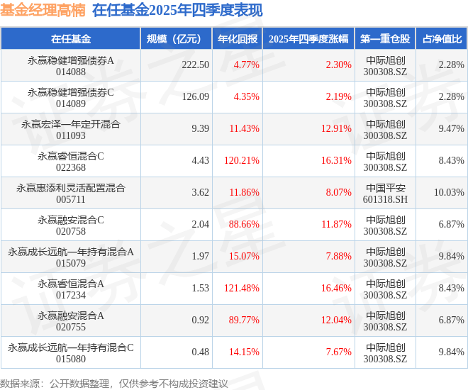 证券之星消息,截止2025年四季度末,基金经理高楠旗下共管理10只基金,本季度表现最佳的为永赢睿恒混合A(017234),季度净值涨16.46%。