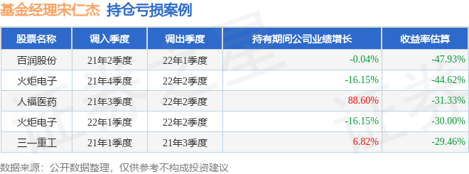 宋仁杰管理的泰康景泰回报混合A基金在21年2季度买入百润股份,在持有3个季度后在22年1季度卖出。持有期间的估算收益率为-47.93%,持有期间百润股份在2021年到2022年的年报营业总收入降幅为0.04%。