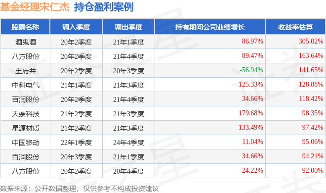 宋仁杰管理的泰康策略优选混合基金在20年2季度买入酒鬼酒,在持有3个季度后在21年1季度卖出。持有期间的估算收益率为305.02%,持有期间酒鬼酒在2020年到2021年的年报营业总收入增幅达86.97%。