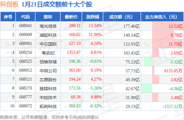 当日科创板成交额前10大个股中7只个股收涨,平均涨幅6.21%,其中海光信息(688041)以成交额177.46亿元排第一。从主力资金流入看,成交额前10大个股中有7只个股呈现主力资金净流入。