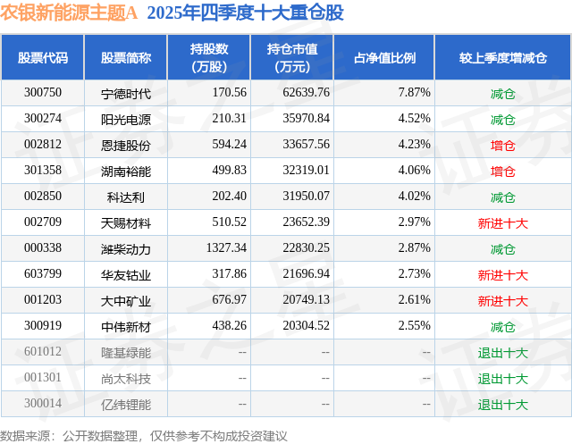 农银新能源主题A的前十大重仓股如下: