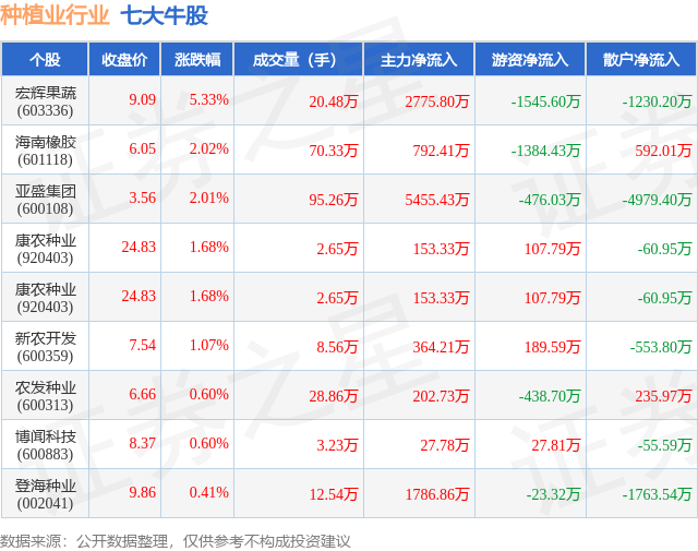 个股表现方面,种植业行业当日领涨股为宏辉果蔬(603336),该股当日报收9.09,上涨5.33%,成交量20.48万,主力资金净流入2775.8万元。海南橡胶(601118)以上涨2.02%紧随其后,该股当日成交量70.33万,主力资金净流入792.41万元。除此之外,亚盛集团(600108)、康农种业(920403)、康农种业(920403)均进入当日牛股之列。具体个股列表见下表: