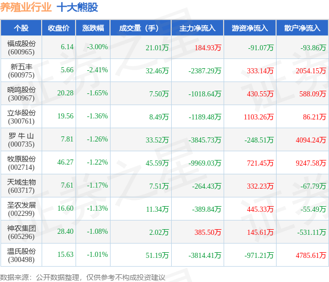 个股表现方面,养殖业行业当日领跌股为福成股份(600965),该股当日报收6.14,下跌3.0%,成交量21.01万,主力资金净流入184.93万元。新五丰(600975)以下跌2.41%紧随其后,该股当日成交量32.46万,主力资金净流出2387.29万元。除此之外,晓鸣股份(300967)、立华股份(300761)、罗 牛 山(000735)均进入当日熊股之列。具体个股列表见下表:
