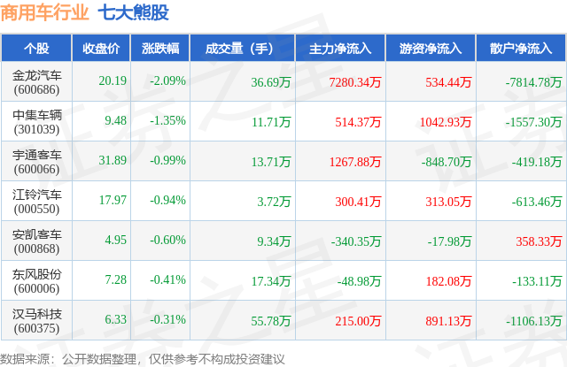 个股表现方面,商用车行业当日领跌股为金龙汽车(600686),该股当日报收20.19,下跌2.09%,成交量36.69万,主力资金净流入7280.34万元。中集车辆(301039)以下跌1.35%紧随其后,该股当日成交量11.71万,主力资金净流入514.37万元。除此之外,宇通客车(600066)、江铃汽车(000550)、安凯客车(000868)均进入当日熊股之列。具体个股列表见下表: