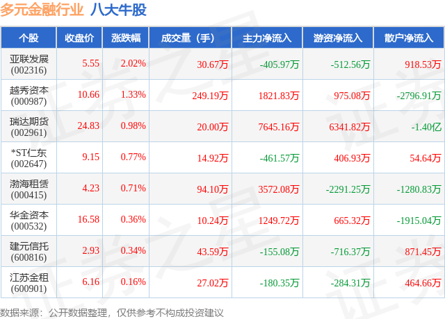 个股表现方面,多元金融行业当日领涨股为亚联发展(002316),该股当日报收5.55,上涨2.02%,成交量30.67万,主力资金净流出405.97万元。越秀资本(000987)以上涨1.33%紧随其后,该股当日成交量249.19万,主力资金净流入1821.83万元。除此之外,瑞达期货(002961)、*ST仁东(002647)、渤海租赁(000415)均进入当日牛股之列。具体个股列表见下表: