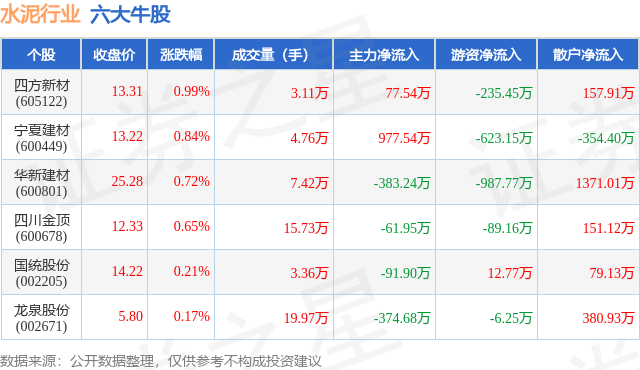 个股表现方面,水泥行业当日领涨股为四方新材(605122),该股当日报收13.31,上涨0.99%,成交量3.11万,主力资金净流入77.54万元。宁夏建材(600449)以上涨0.84%紧随其后,该股当日成交量4.76万,主力资金净流入977.54万元。除此之外,华新建材(600801)、四川金顶(600678)、国统股份(002205)均进入当日牛股之列。具体个股列表见下表: