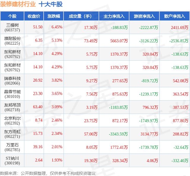 个股表现方面,装修建材行业当日领涨股为三棵树(603737),该股当日报收51.5,上涨6.45%,成交量17.3万,主力资金净流出188.83万元。濮耐股份(002225)以上涨5.13%紧随其后,该股当日成交量73.49万,主力资金净流入5663.07万元。除此之外,东和新材(920792)、东和新材(920792)、瑞泰科技(002066)均进入当日牛股之列。具体个股列表见下表: