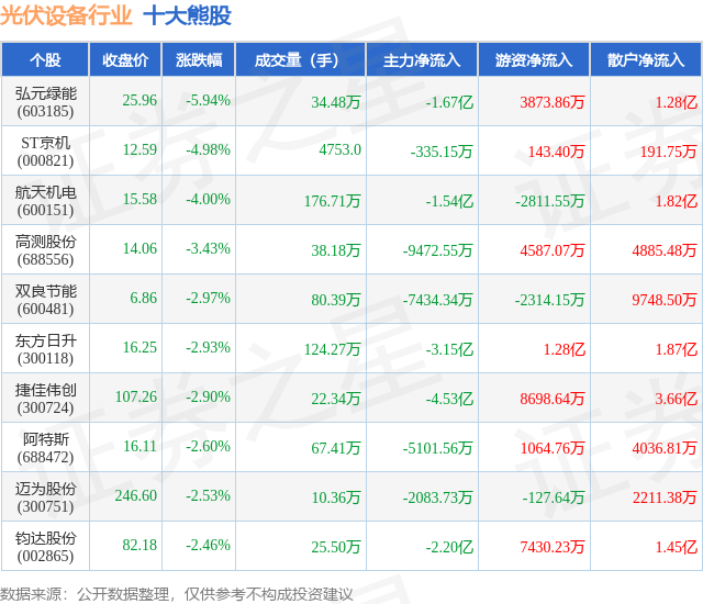 个股表现方面,光伏设备行业当日领跌股为弘元绿能(603185),该股当日报收25.96,下跌5.94%,成交量34.48万,主力资金净流出1.67亿元。ST京机(000821)以下跌4.98%紧随其后,该股当日成交量4753.0,主力资金净流出335.15万元。除此之外,航天机电(600151)、高测股份(688556)、双良节能(600481)均进入当日熊股之列。具体个股列表见下表: