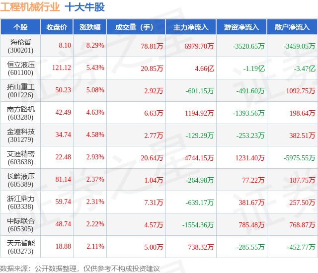 个股表现方面,工程机械行业当日领涨股为海伦哲(300201),该股当日报收8.1,上涨8.29%,成交量78.81万,主力资金净流入6979.7万元。恒立液压(601100)以上涨5.43%紧随其后,该股当日成交量20.85万,主力资金净流入4.66亿元。除此之外,拓山重工(001226)、南方路机(603280)、金道科技(301279)均进入当日牛股之列。具体个股列表见下表:
