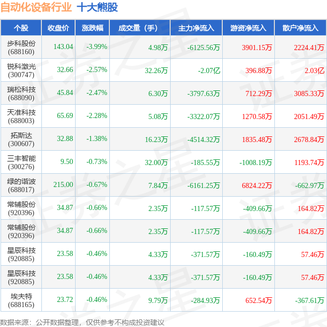 个股表现方面,自动化设备行业当日领跌股为步科股份(688160),该股当日报收143.04,下跌3.99%,成交量4.98万,主力资金净流出6125.56万元。锐科激光(300747)以下跌2.57%紧随其后,该股当日成交量32.26万,主力资金净流出2.07亿元。除此之外,瑞松科技(688090)、天准科技(688003)、拓斯达(300607)均进入当日熊股之列。具体个股列表见下表: