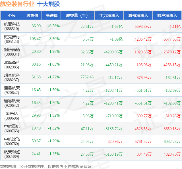 个股表现方面,航空装备行业当日领跌股为航亚科技(688510),该股当日报收36.9,下跌6.58%,成交量22.61万,主力资金净流出1.67亿元。派克新材(605123)以下跌3.5%紧随其后,该股当日成交量6.57万,主力资金净流出1.09亿元。除此之外,钢研高纳(300034)、北摩高科(002985)、超卓航科(688237)均进入当日熊股之列。具体个股列表见下表:
