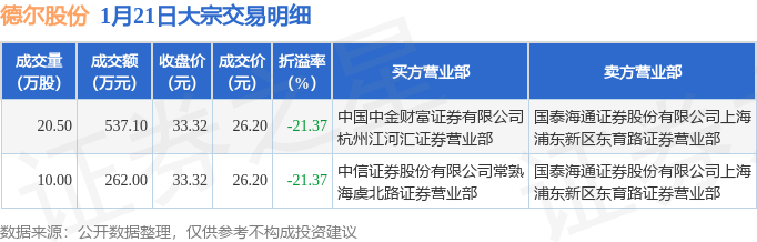 证券之星消息,1月21日德尔股份发生大宗交易,交易数据如下: