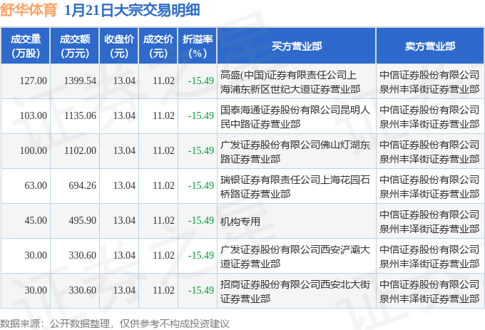 证券之星消息,1月21日舒华体育发生大宗交易,交易数据如下: