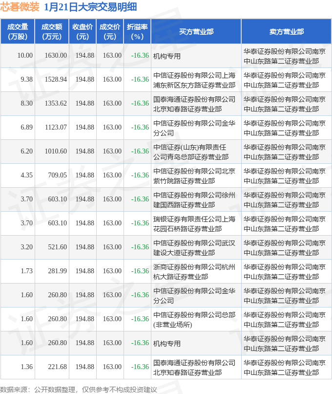 证券之星消息,1月21日芯碁微装发生大宗交易,交易数据如下: