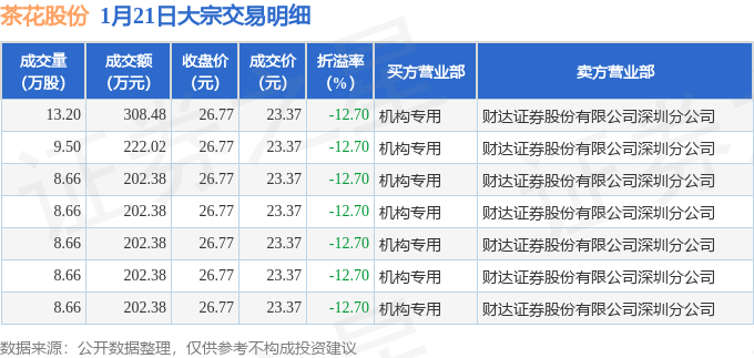 证券之星消息,1月21日茶花股份发生大宗交易,交易数据如下: