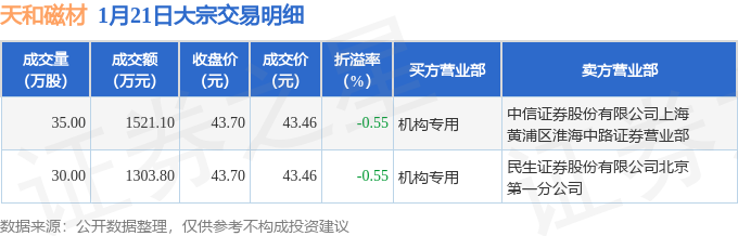 证券之星消息,1月21日天和磁材发生大宗交易,交易数据如下: