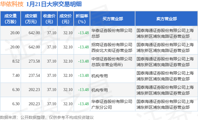 证券之星消息,1月21日华依科技发生大宗交易,交易数据如下: