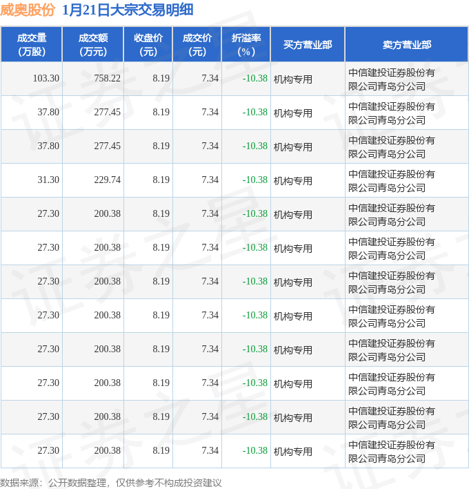 证券之星消息,1月21日威奥股份发生大宗交易,交易数据如下:
