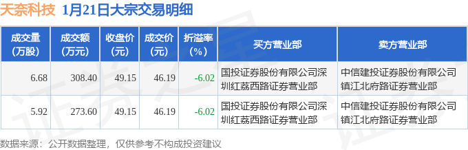 证券之星消息,1月21日天奈科技发生大宗交易,交易数据如下: