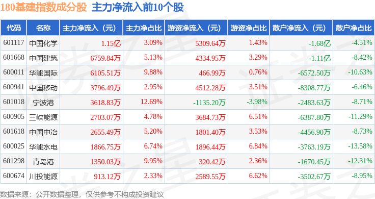 资金流向方面,180基建(000025)指数成份股当日主力资金净流出合计14.82亿元,游资资金净流入合计8.27亿元,散户资金净流入合计6.55亿元。成份股资金流向详情见下表: