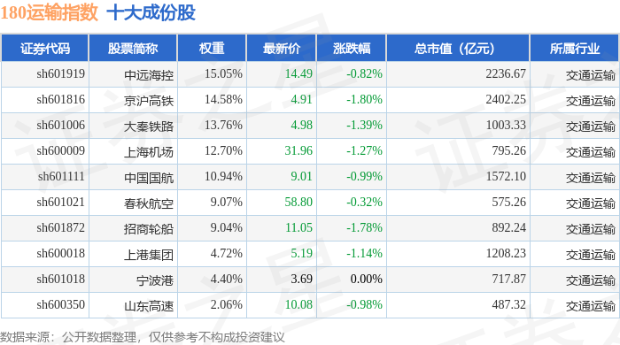 证券之星消息,1月21日,180运输(000027)指数报收于768.38点,跌1.16%,成交62.14亿元,换手率0.5%。当日该指数成份股中,下跌的有11家,京沪高铁以1.8%的跌幅领跌。