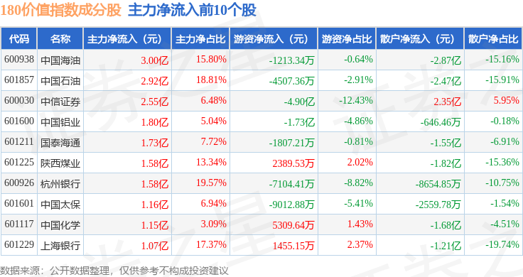 资金流向方面,180价值(000029)指数成份股当日主力资金净流出合计1.83亿元,游资资金净流出合计1.44亿元,散户资金净流入合计3.27亿元。成份股资金流向详情见下表: