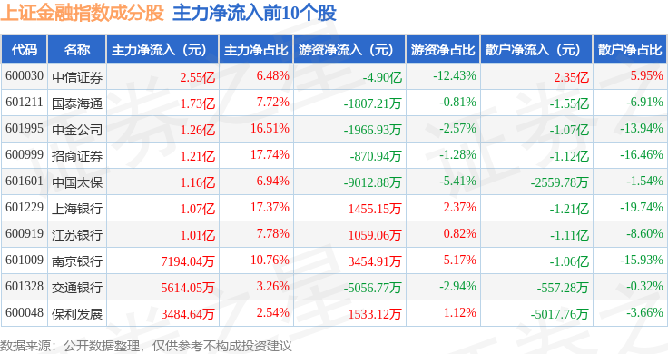 资金流向方面,上证金融(000038)指数成份股当日主力资金净流出合计7.19亿元,游资资金净流出合计7.9亿元,散户资金净流入合计15.09亿元。成份股资金流向详情见下表: