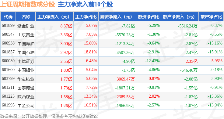 资金流向方面,上证周期(000063)指数成份股当日主力资金净流入合计20.51亿元,游资资金净流出合计19.25亿元,散户资金净流出合计1.26亿元。成份股资金流向详情见下表: