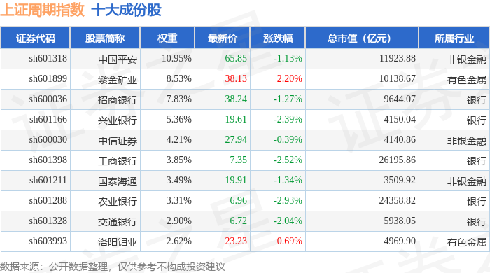 上证周期(000063)指数十大成份股详情如下: