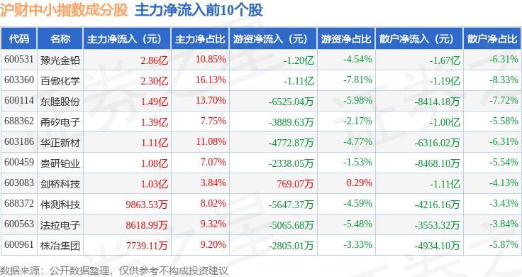 资金流向方面,沪财中小(000091)指数成份股当日主力资金净流入合计13.81亿元,游资资金净流出合计5.68亿元,散户资金净流出合计8.13亿元。成份股资金流向详情见下表: