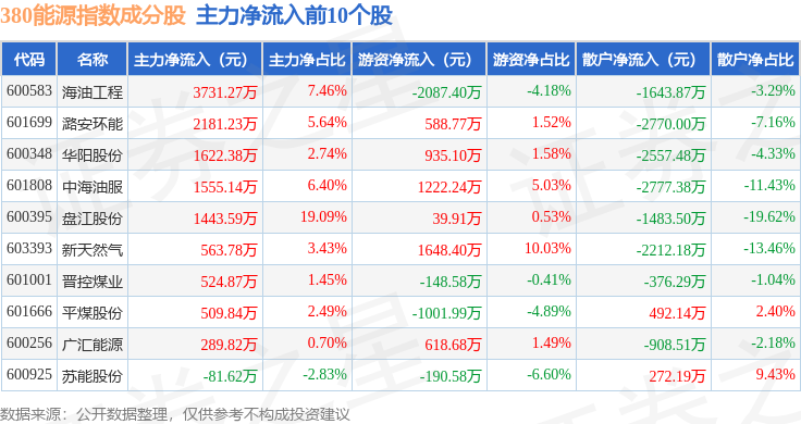 资金流向方面,380能源(000104)指数成份股当日主力资金净流入合计1492.35万元,游资资金净流入合计3901.04万元,散户资金净流出合计5393.39万元。成份股资金流向详情见下表: