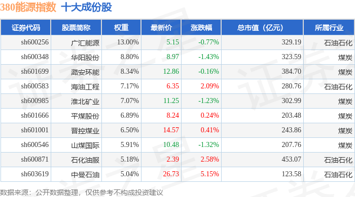 380能源(000104)指数十大成份股详情如下: