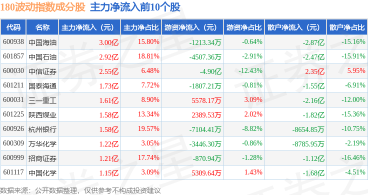 资金流向方面,180波动(000129)指数成份股当日主力资金净流出合计18.31亿元,游资资金净流入合计21.94亿元,散户资金净流出合计3.63亿元。成份股资金流向详情见下表: