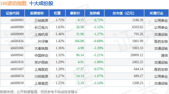 180波动(000129)指数十大成份股详情如下: