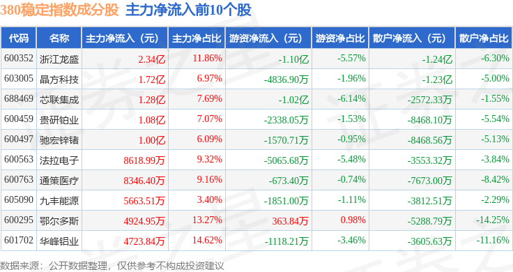 资金流向方面,380稳定(000142)指数成份股当日主力资金净流出合计11.5亿元,游资资金净流入合计5.35亿元,散户资金净流入合计6.16亿元。成份股资金流向详情见下表:
